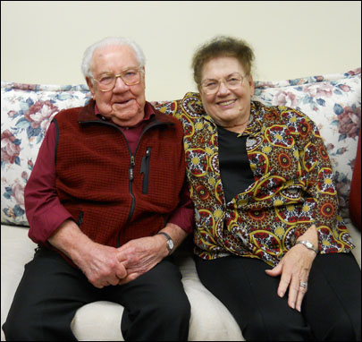After 67 years together, you’d have to wonder if these two haven’t evolved into carbon copies of each other. Nothing could be further from the truth! While they do agree on most points, there is still room for a difference of opinion. Chuck is boisterous, outgoing and social. He is fascinated by people’s names and takes pride in his memory of them. He is a self-described neat-nick who claims his greatest achievement as “My family-my sons and wife.” To which Mary responds with a smile, “Note the order there?” Chuck also maintains he likes being home, to which Mary argues, “Unless YOU want to square dance!” Mary is quietly reflective and calm and considers herself to be the backbone of the family. Chuck agrees. Chuck enjoys western music and “Dancing with the Stars.” Mary’s favorite song is, “You Are My Sunshine” and prefers news programs. While Chuck, who loves to fly fish and cites Tangle Lakes as his favorite spot, is busy wetting his line, Mary is most likely to be found safe and dry on the banks, reading. Although they wouldn’t trade any of their sons for one, they wish they’d had a daughter. Fortunately, there are daughters-in-law and grand-daughters galore that have been added to their large, happy family.